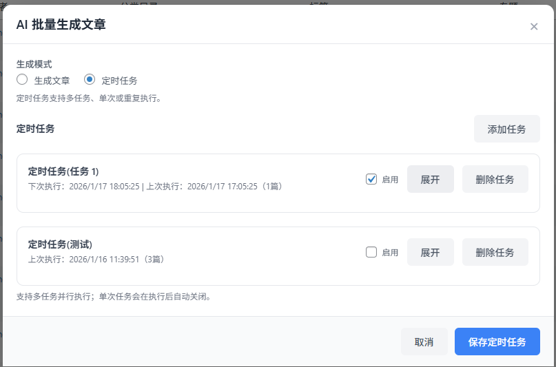AI定时批量生成文章使用的是wp-cron,并非是系统级定时任务,依赖于访问请求,所以当你网站流量访问次数较少的时候可能并不能及时触发定时任务。